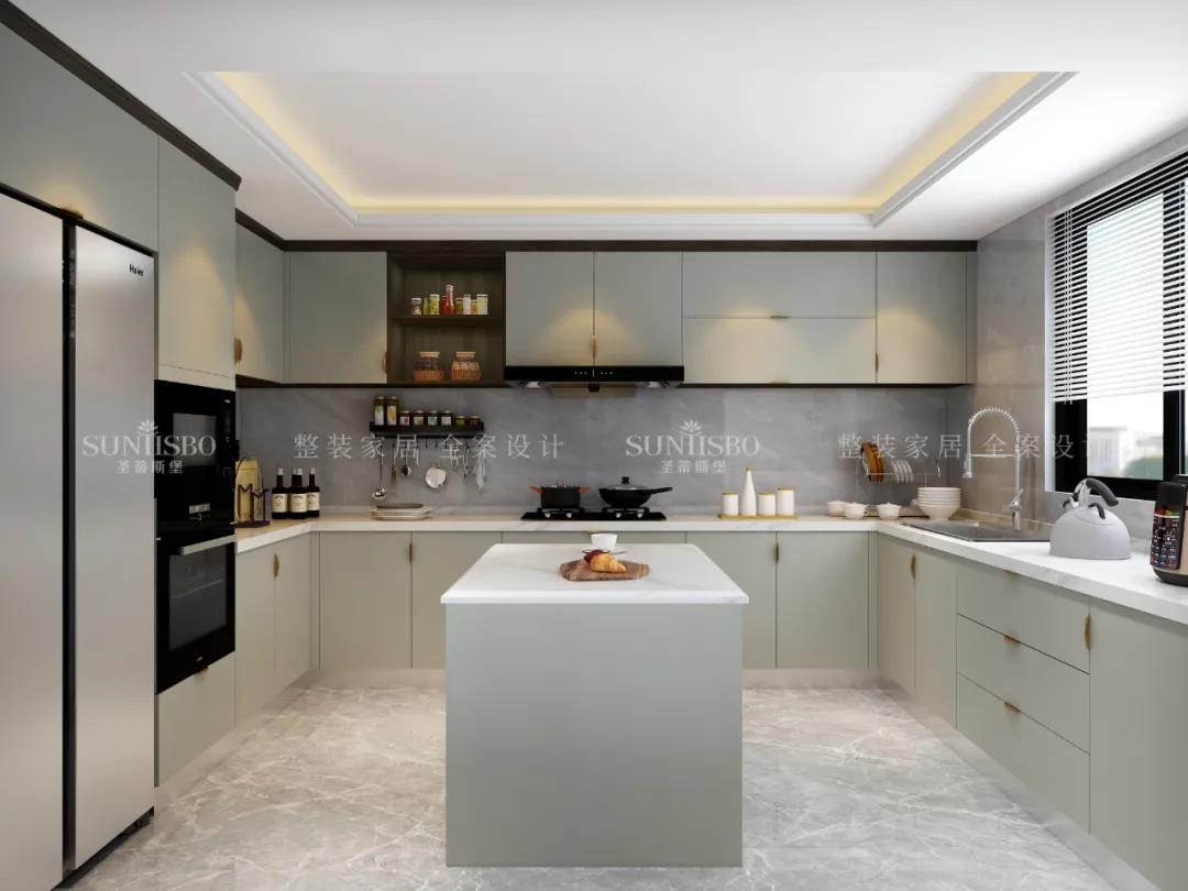 廚房的淺灰色調與明媚的自然光線(xiàn)重合,由空到滿(mǎn),完成了一場(chǎng)空間與質(zhì)感的展示。案臺上擺放的居家生活用品,充斥著(zhù)溫馨的生活氣息。質(zhì)感櫥柜線(xiàn)條秩序排列出廚房空間的簡(jiǎn)約主題感。日光穿過(guò)百葉窗,將生活空間梳理的溫柔且愜意!